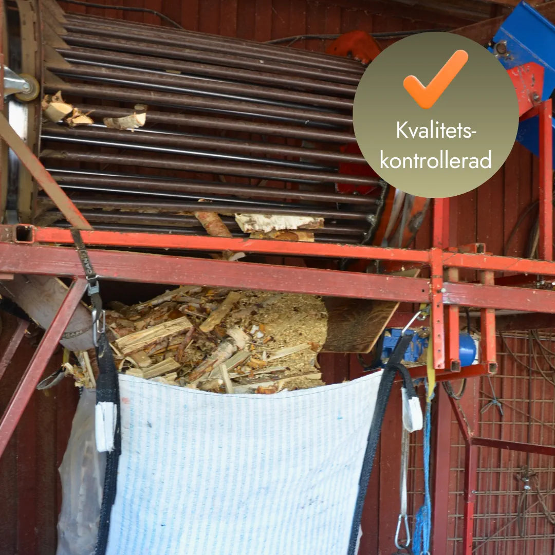 Vi sorterar all ved genom en renstrumma som avlägsnar stickor, småpinnar, bark och smuts innan packning.